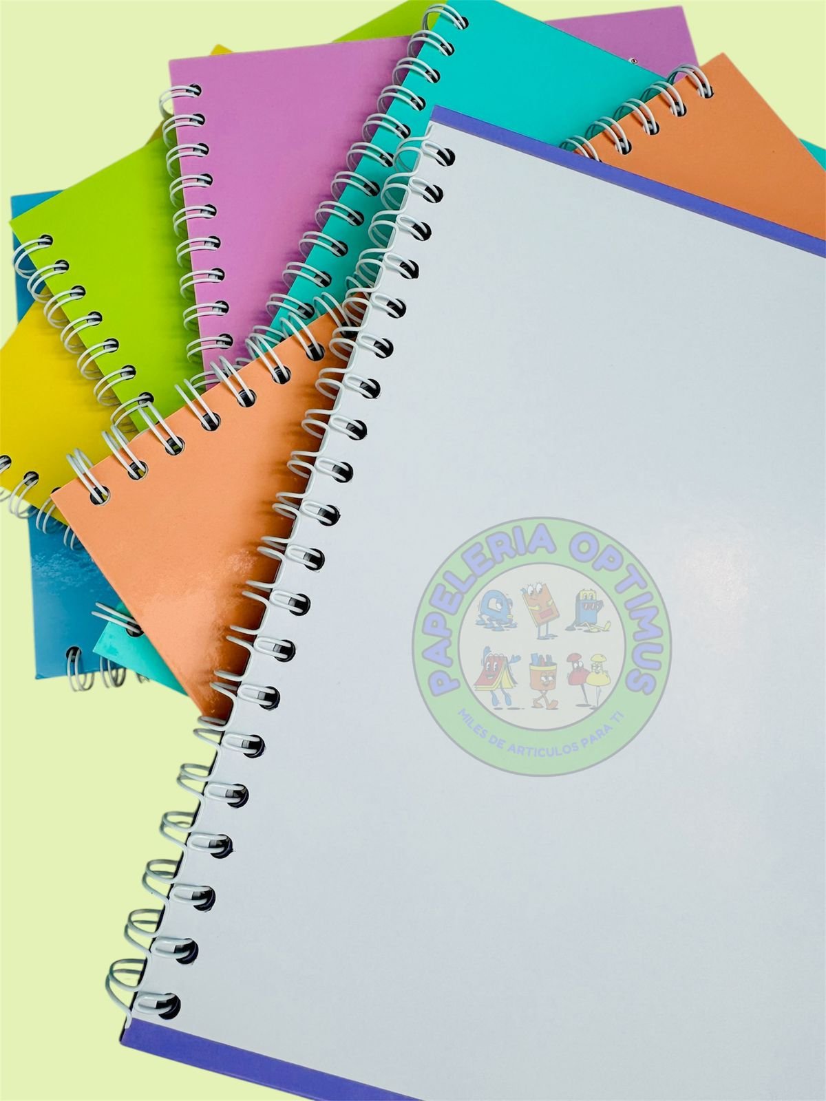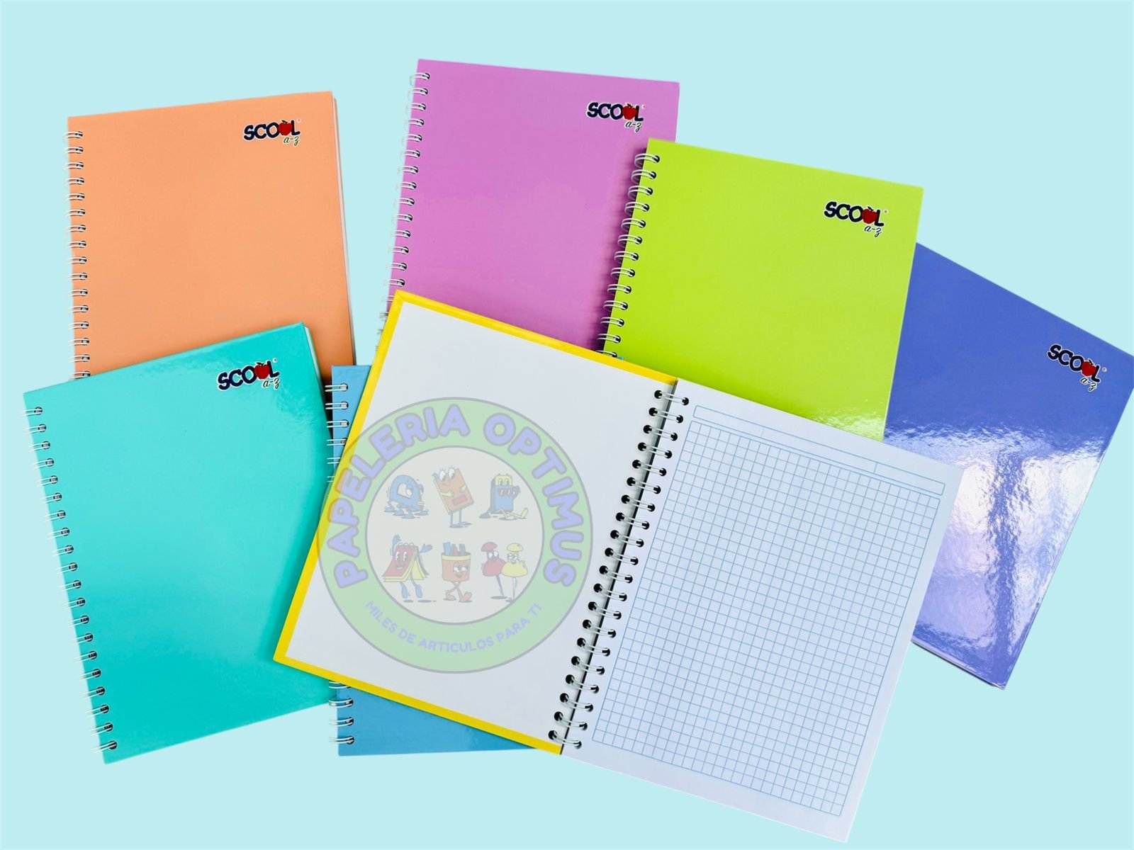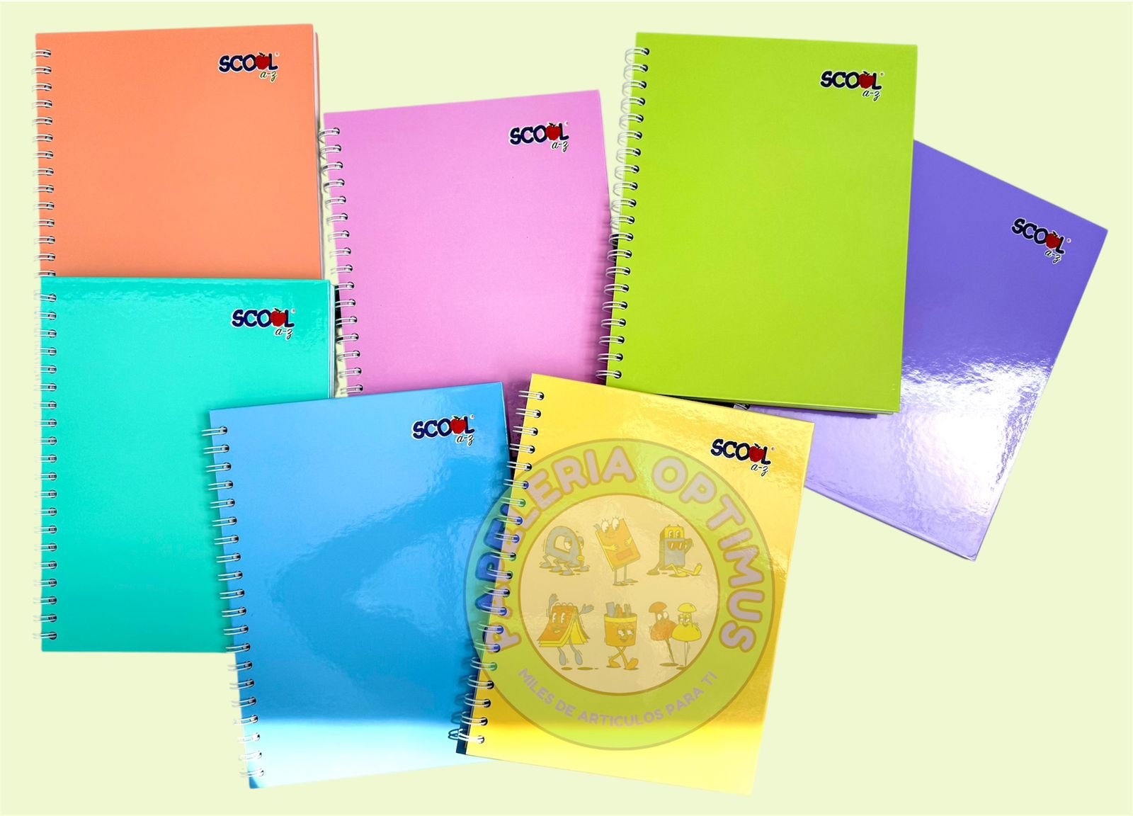 Libreta profesional Scool 100 hojas de pasta dura reforzada con doble espiral en varios colores.